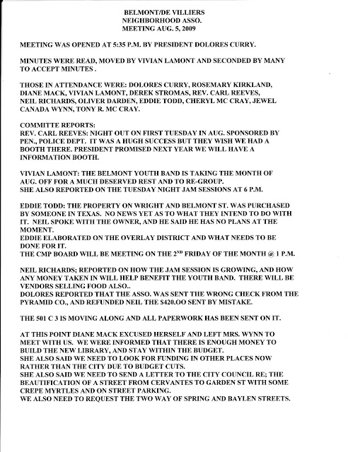 There was general discussion on the BBQ Cook-Off originally scheduled for Belmont-DeVilliers and diverted to Magee Field because of the costs in our neighborhood of blocking off the streets, paying for police security, and so forth. Some members are worried that other events such as Goombay and the Black History festival might move to the Haynes park area under the interstate freeway to save on expenses. Mr. Richards mentioned that a proposed October Gospel festival would include an event at Belmont-DeVilliers. He was told that a city staffer suggested they hold it under the interstate instead. Mr. Richards is worried that if we lose our festivals, some of our cultural heritage and character will also be lost.